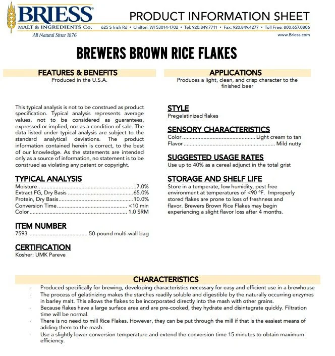 These rice flakes are made specifically for brewing, developing characteristics necessary for easy and efficient use in a brewhouse. They have a large surface area and are pre-cooked, so they hydrate and disintegrate quickly and offer a light, clean, and crisp character to the finished beer.